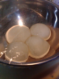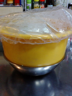 洗い桶に湯を張り、ボウルを乗せて中にタオルを敷いて温度調整し、コネあがった生地を入れた器を入れ、一時発酵させた所。
