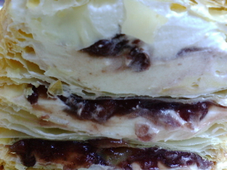 パイに小豆とクリームを重ね乗せてはまたパイを乗せ…と剥がしたパイをもとに戻すように作業を繰り返す。