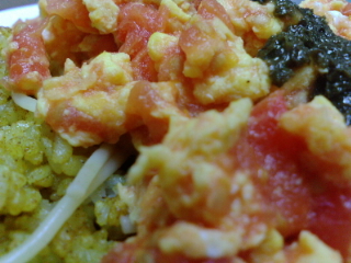 これにトマトを湯剥きして刻み、たまごとスクランブル。
