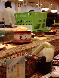 サーモンと書いてある台が、向きで「ーモン」に読める。