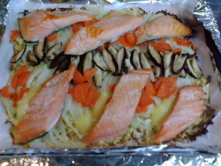 オーブンの鉄板いっぱいに野菜を広げ、チーズの上に魚を置いて、バターを少しだけ乗せたらオーブンにgo!