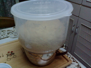 ぬるま湯で粉を捏ねて蒸し器に並べる。